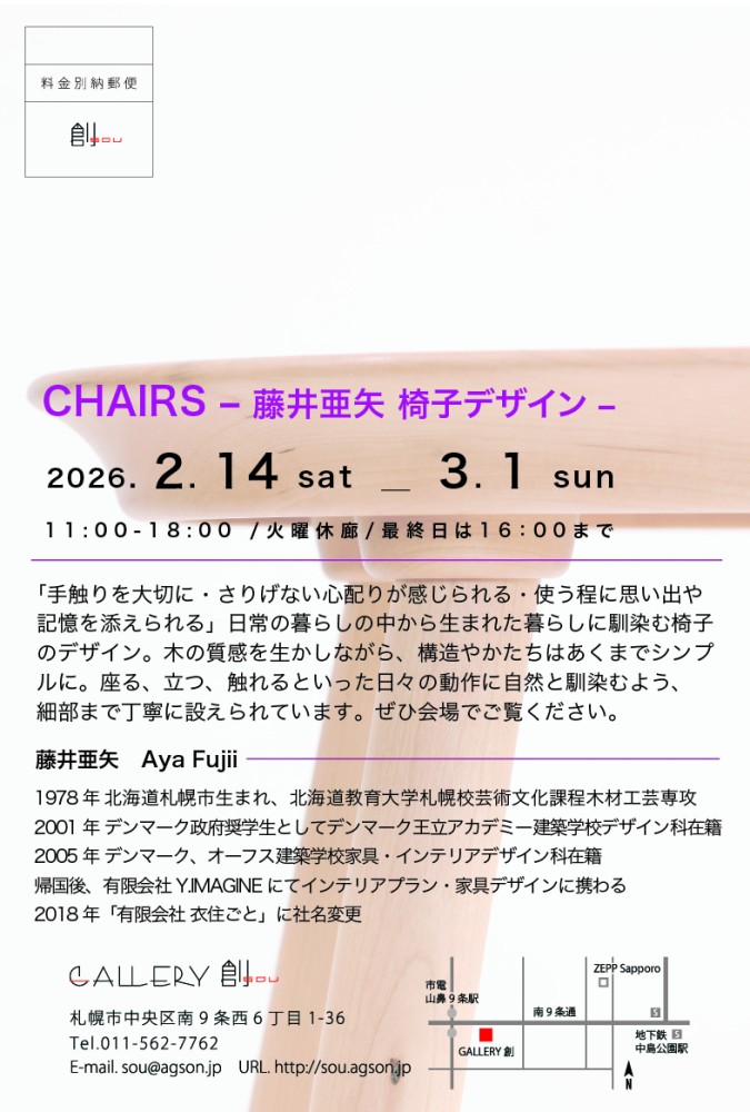 2026/2/14〜3/1個展「CHAIRS-藤井亜矢 椅子デザイン」(札幌)