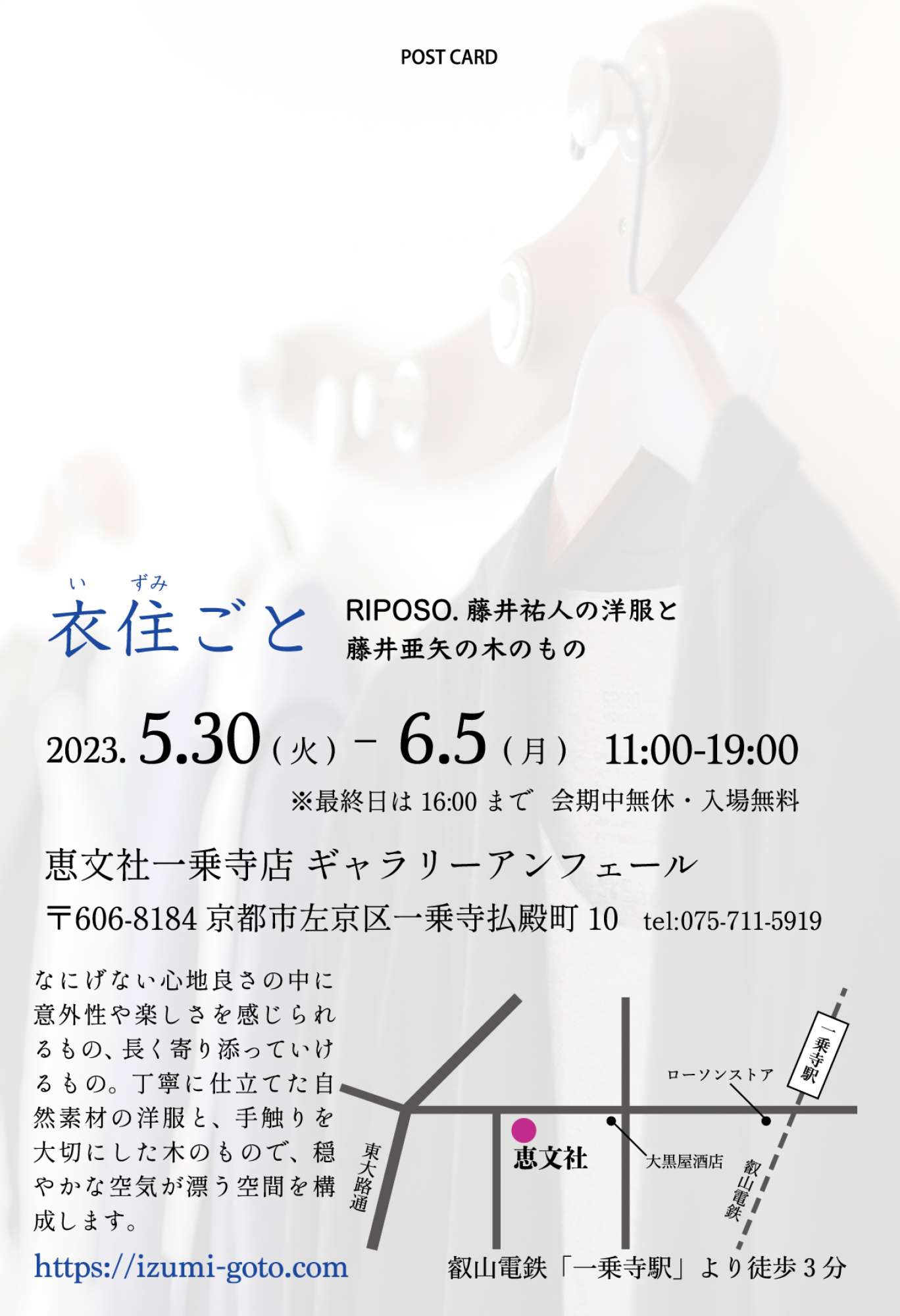 RIPOSO. INFORMATION INFORMATION 2026年展示会予定 2025/11/29~12/14 RIPOSO. EXHIBITION(鎌倉) 2025/10/28~11/2 衣住ごと(盛岡) 2025/9/19~9/30 RIPOSO.(函館) 2025/6/19~6/24 RIPOSO.藤井祐人の洋服展(浦和) 2025/5/17~5/29 RIPOSO.アートなシャツ(帯広) 2025/4/15~4/19 RIPOSO.藤井祐人の洋服展(札幌) 恵文社一乗寺店(京都)noteに展示会情報が掲載されています 2025/3/25~3/31 LIVING DESIGN+CLOTHES(京都) 2025年展示会予定 2024/12/5〜12/15 RIPOSO.藤井祐人の洋服(静岡) 2024/10/11〜10/15 RIPOSO.フジイユウト(仙台) 12345678910 NEXT ARCHIVES ALL 2025 2024 2023 2022 2021 2020 2019 2018 2017 2016 2015 2014 2013 2012 2011 2010 2009