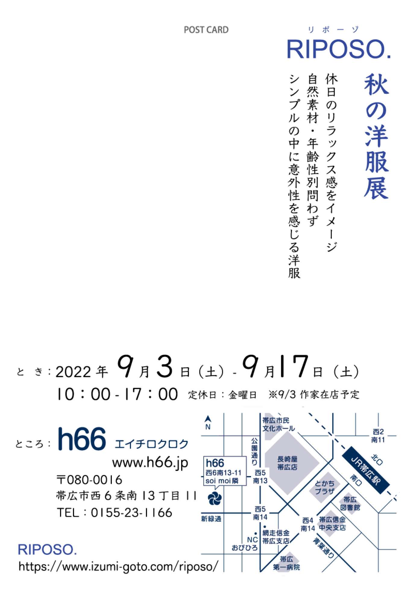 2022/9/3-9/17 RIPOSO.秋の洋服展(帯広) h66帯広市西6条南13丁目11 2022年9月3日(土)-9月17日(土)10:00-17:00 定休日:金曜日 ※9/3作家在廊予定2年ぶり、帯広のh66での展示販売会です。 雑誌「チルチンびと」113号のチルチンびと広場に掲載されました。 2022/7/20-7/31 夏・リポーゾ・着る(札幌)